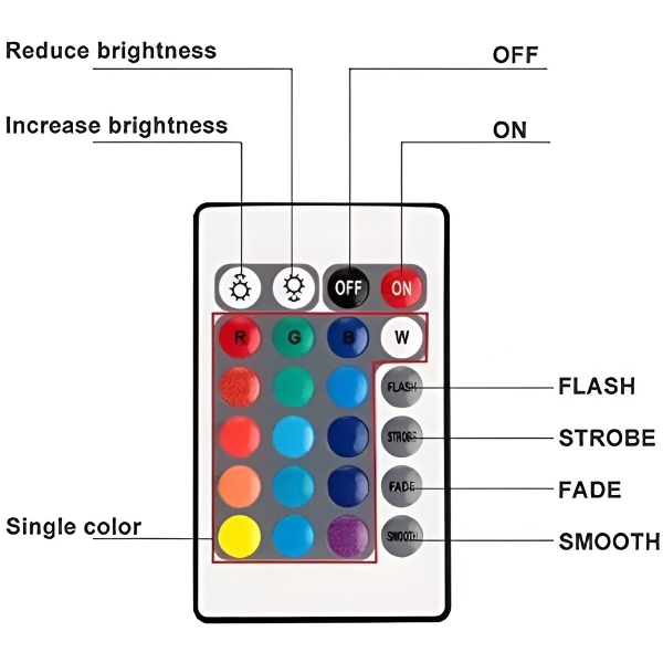 AQUASHEIN viene con un cómodo mando a distancia que le permite ajustar la iluminación con facilidad. Con 24 teclas, puedes elegir entre 16 colores RGB y cuatro modos dinámicos (flash, estroboscópico, fundido, suave). Controla las luces desde una distancia de hasta 10 metros, garantizando una personalización sin complicaciones.