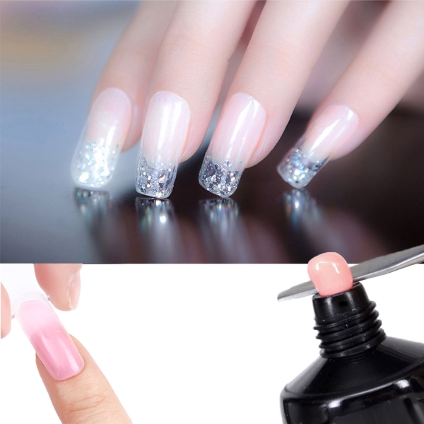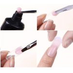Aplica una capa delgada de poly gel bajo la uña artificial y luego la pegarás a tu uña natural. Después de secarlo en la lámpara LED, simplemente quita la una artificial.