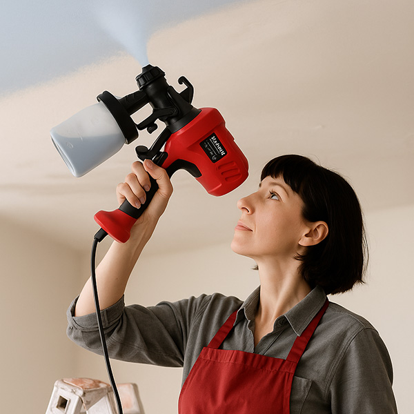 La boquilla especial produce una fina niebla de pintura que se asienta uniformemente, sin rayas ni parches. La herramienta crea la sensación de que cada zona se pinta sola «como debe ser», sin importar el material, la experiencia del usuario o la dirección del movimiento.
